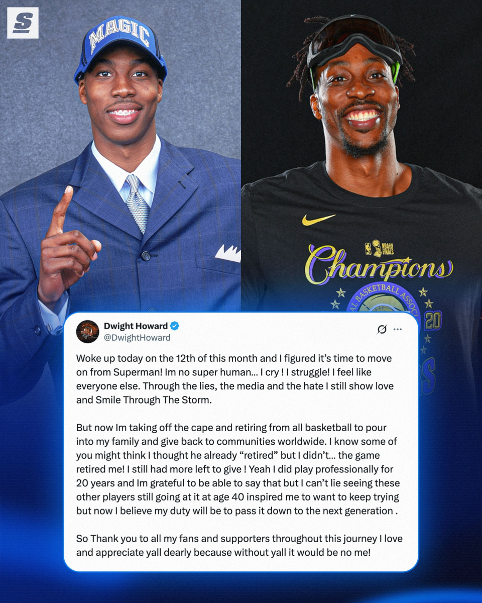 霍华德NBA生涯曾先后效力于魔术、湖人、火箭、老鹰、黄蜂、奇才、湖人、76人、湖人。他已经入选名人堂,却没有正式宣布退役,今天他终于做出决定,长文如下——
